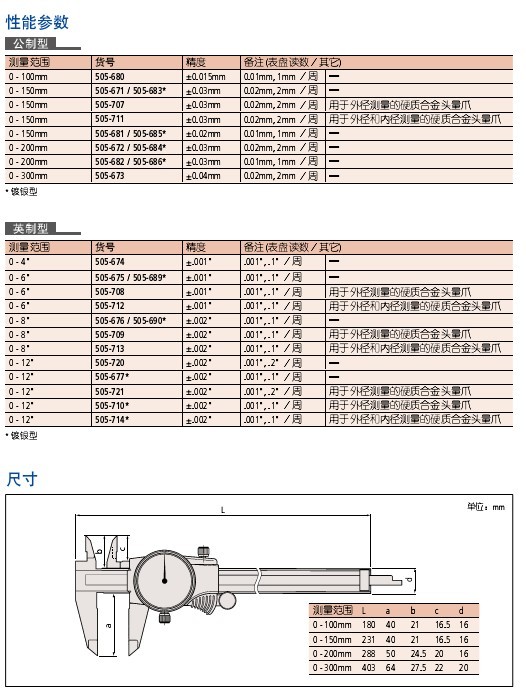 全新表盤移動設計,可實現極平穩(wěn)地滑行并具有良好的防震保護功能。 滑行表面鍍鈦,經久耐用(不包括0-300mm和0-12"型),經過100,000次滑行試驗,無磨損現象。 可測量外徑、內徑、深度和階差。